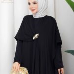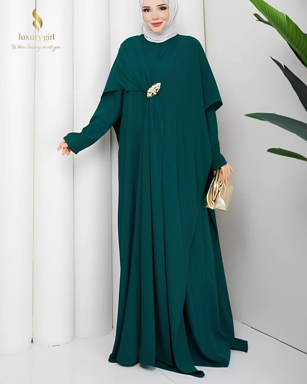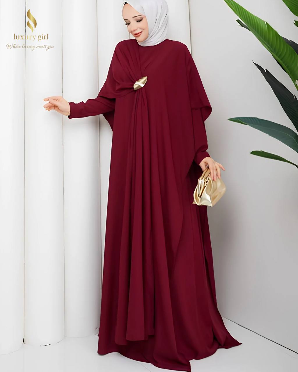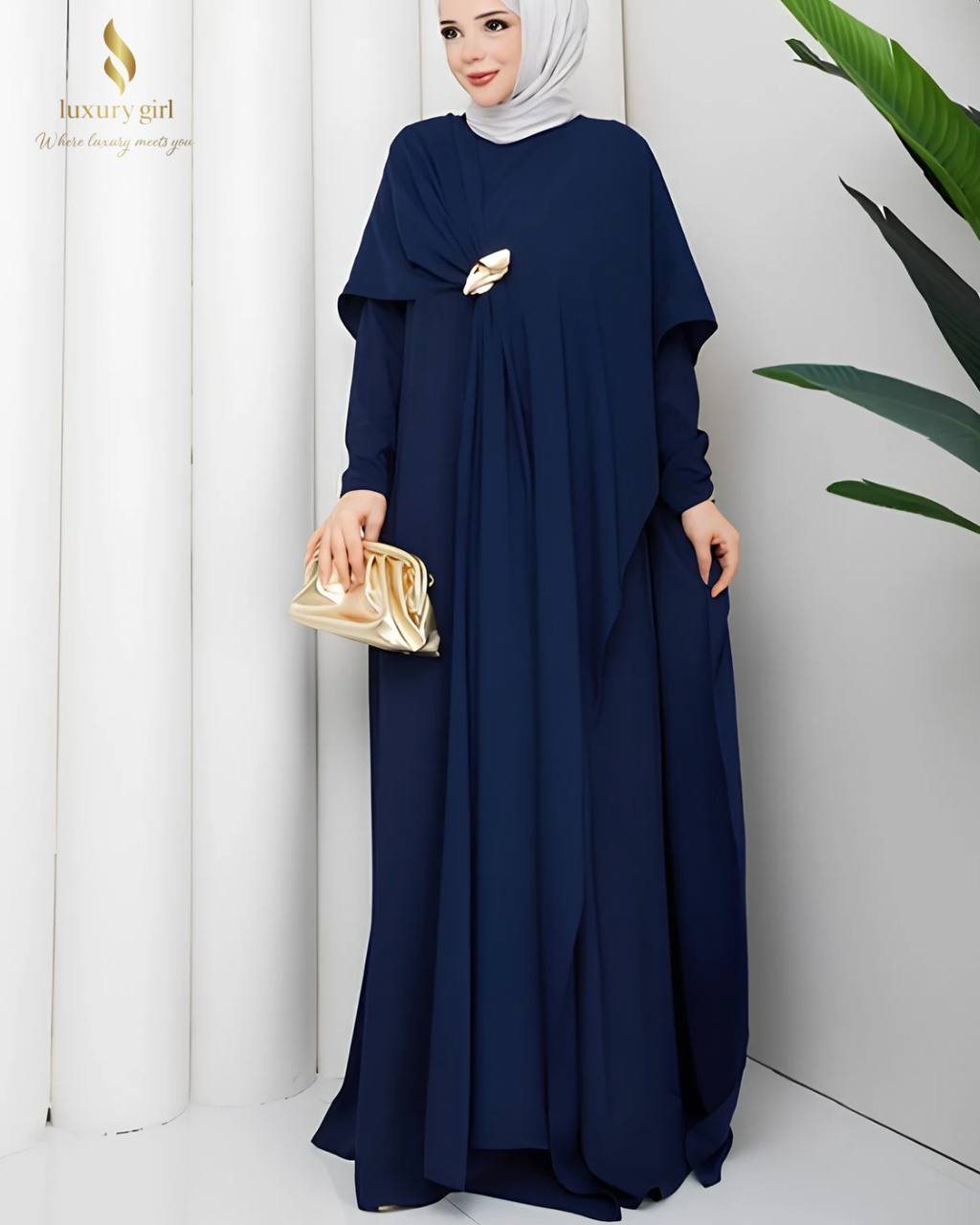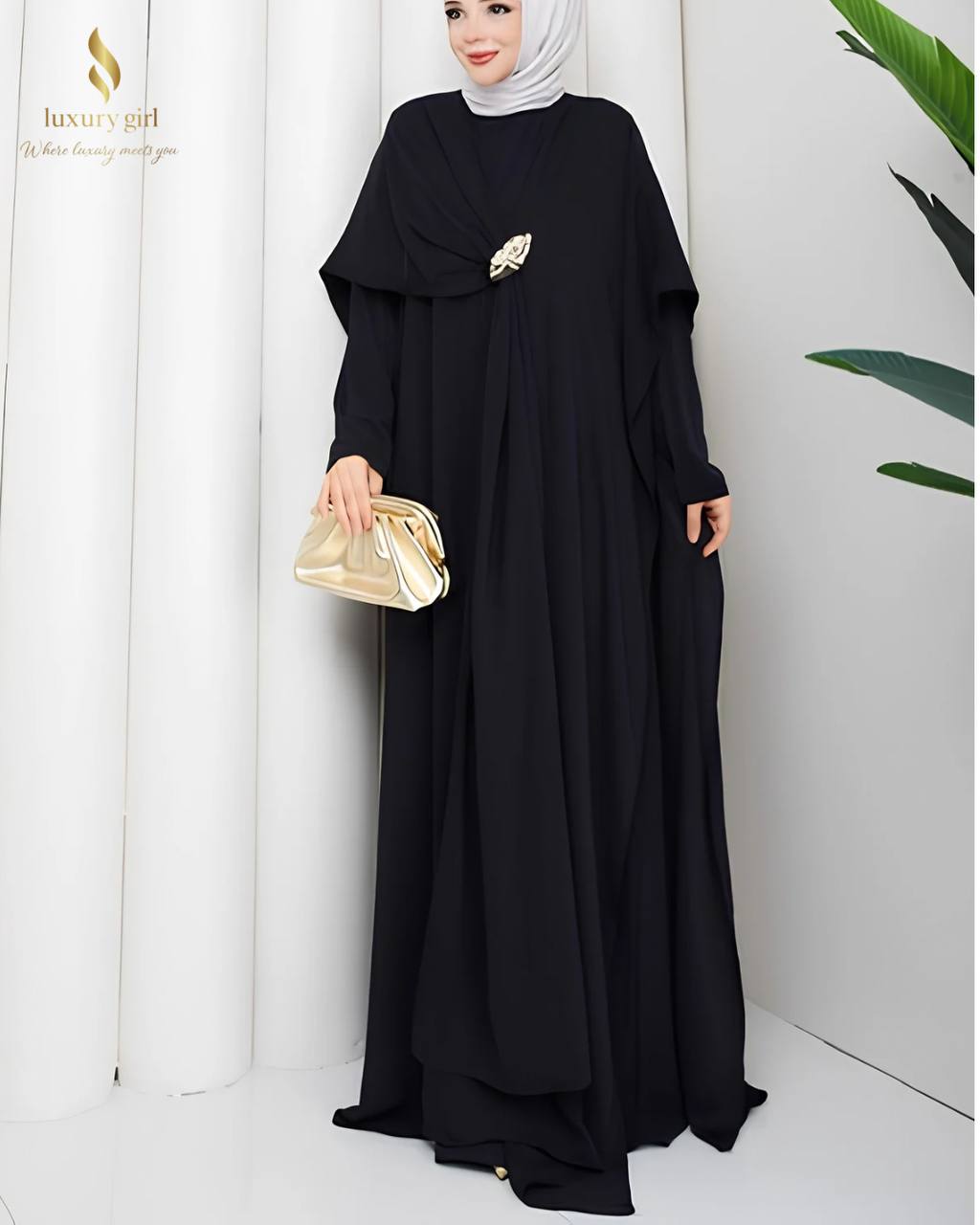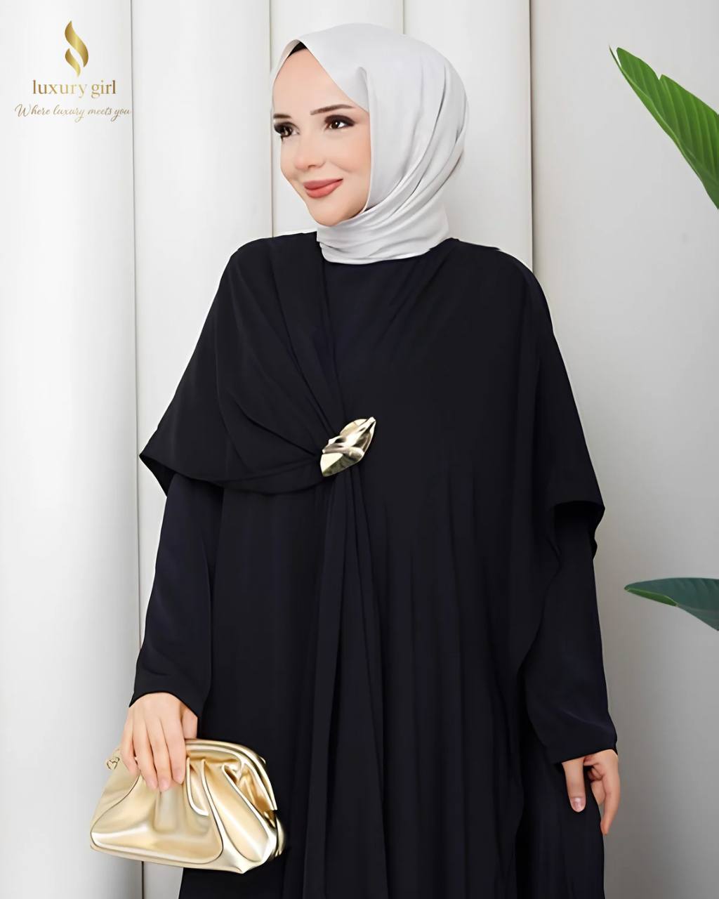 تميز التصميم: تأتي العباية بتصميم الطبقة العلوية المزدوجة مع ثنيات (دراب) أمامية انسيابية تضفي حركة راقية وجذابة أثناء المشي. ما يميز هذه القطعة هو المشبك الذهبي الجانبي الذي يجمع الطبقات بأسلوب فني، مما يمنح العباية لمسة من الفخامة الهادئة دون مبالغة.