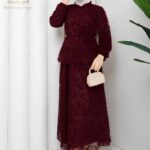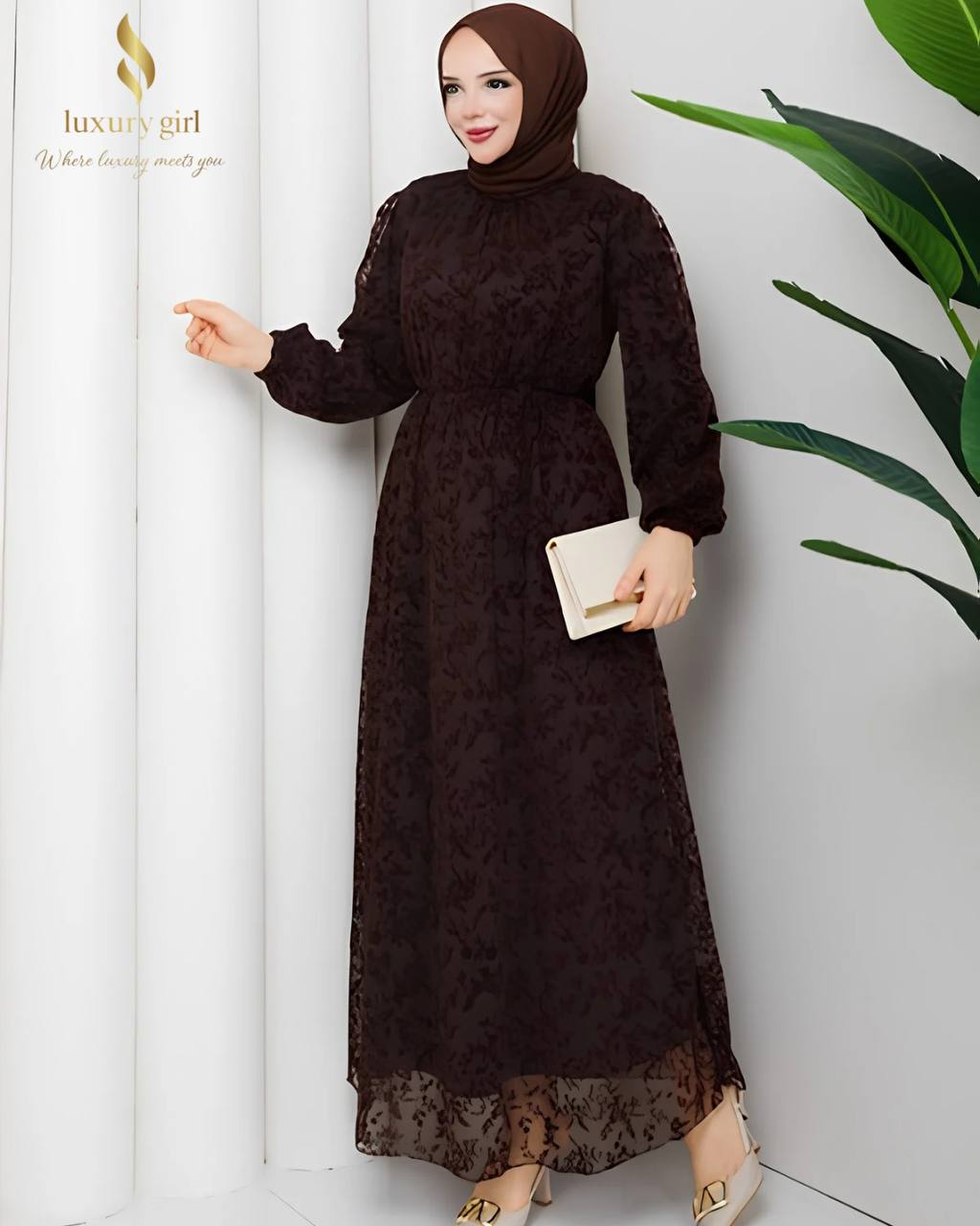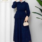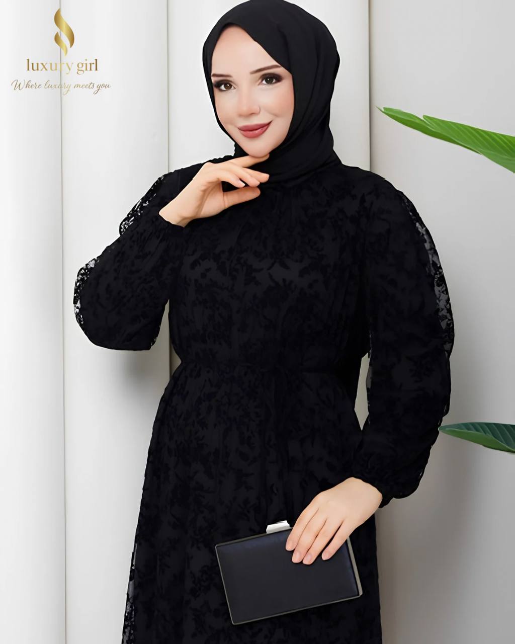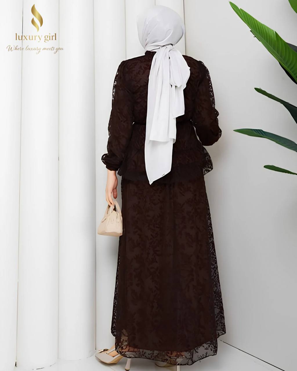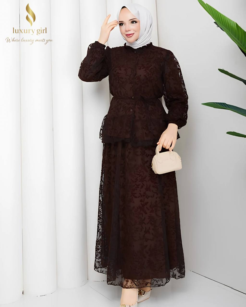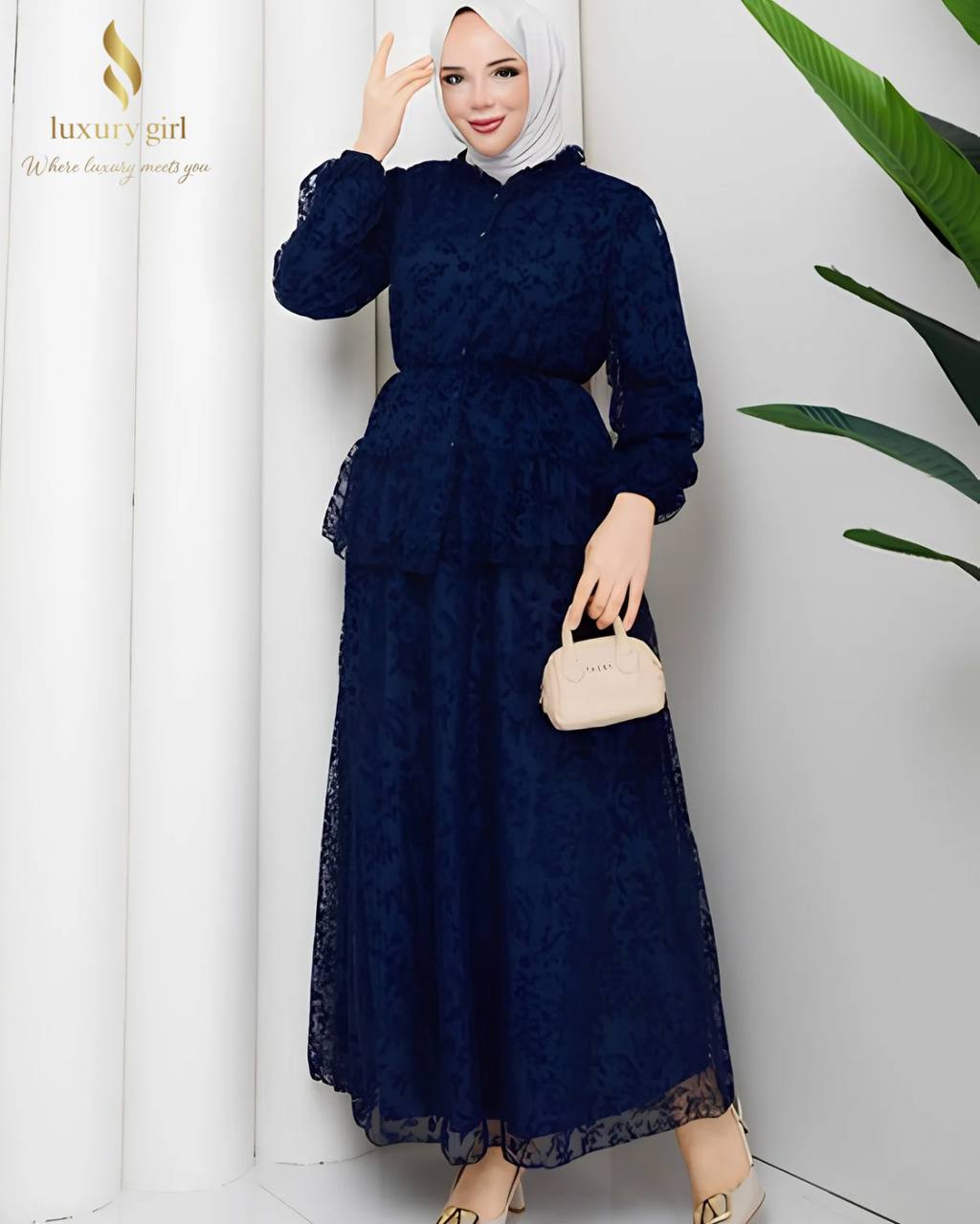 تفاصيل التصميم والقصة: يتكون الطقم من جاكيت وتنورة طويلة مصممة بنظام الطبقتين؛ حيث تأتي الطبقة الخارجية من الدانتيل التركي الفاخر بتطريزات دقيقة، مدعومة ببطانة داخلية ناعمة توفر تغطية كاملة وراحة قصوى. الجاكيت مصمم بقصة مرتبة (Tailored Fit) مع تحديد دقيق عند الخصر لإبراز القوام بشكل أنيق، بينما تنسدل التنورة الطويلة بانسيابية تمنحكِ حركة واثقة وفخمة في كل خطوة.