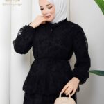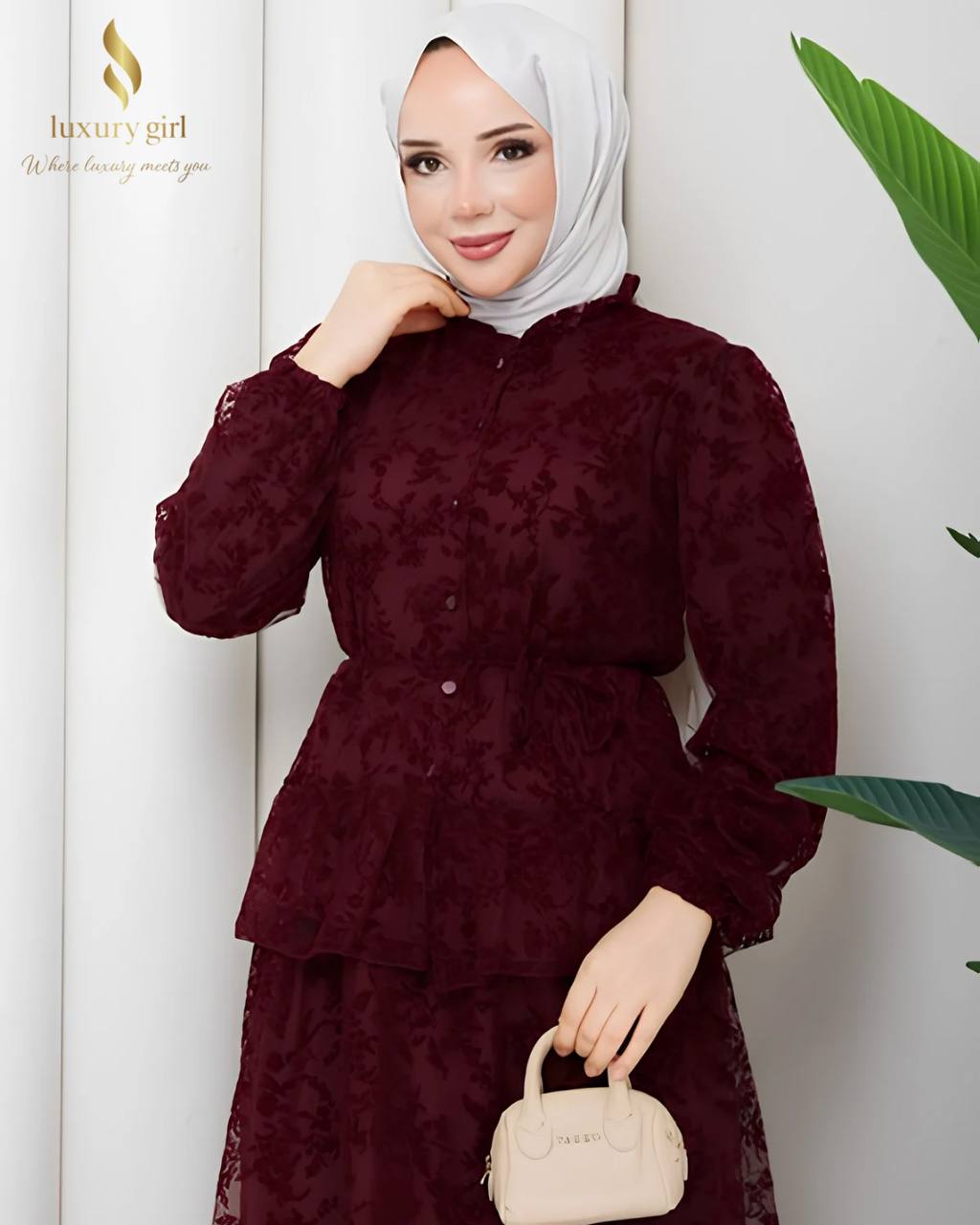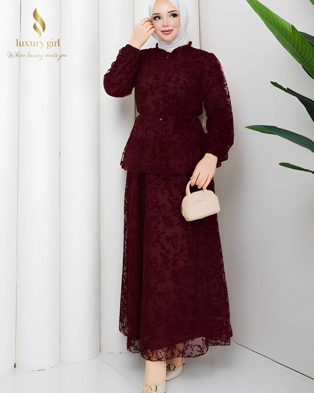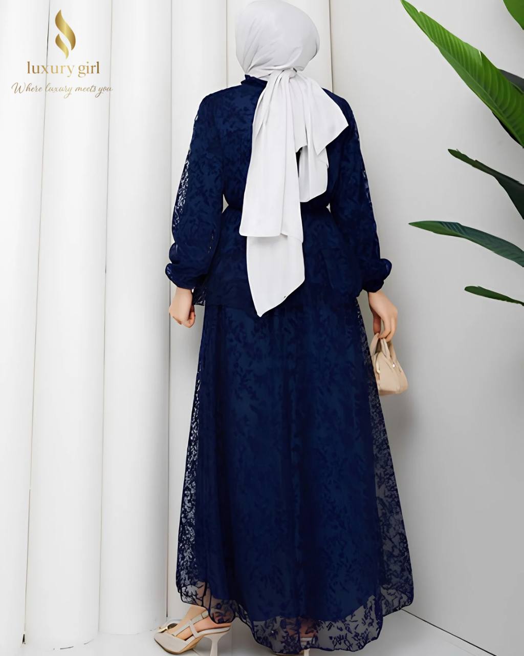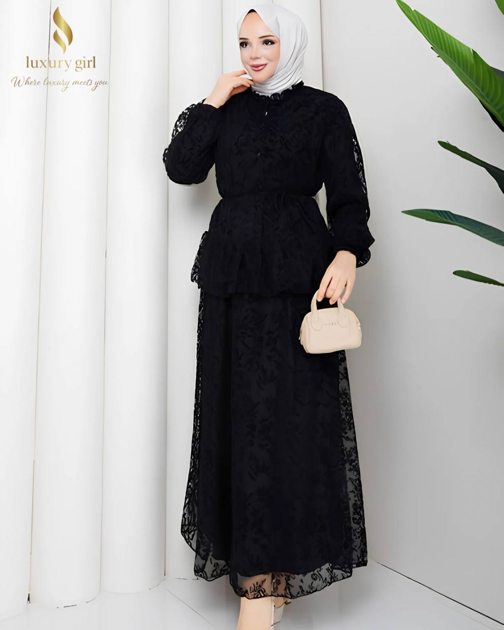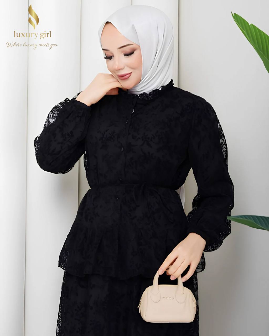يعتبر هذا الطقم الخيار الأول للمرأة التي تبحث عن طقم دانتيل قطعتين يجمع بين رقة التفاصيل وهيبة التصميم. تم ابتكار هذا الطقم ليكون قطعة استثنائية في خزانة ملابسك، حيث يدمج بين الطبقات المتعددة ليعطيكِ مظهراً ملكياً محتشماً.