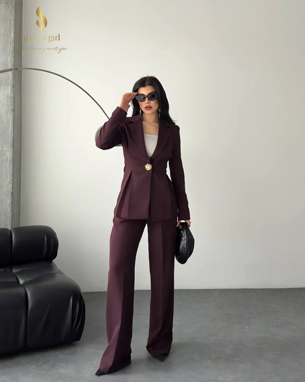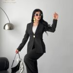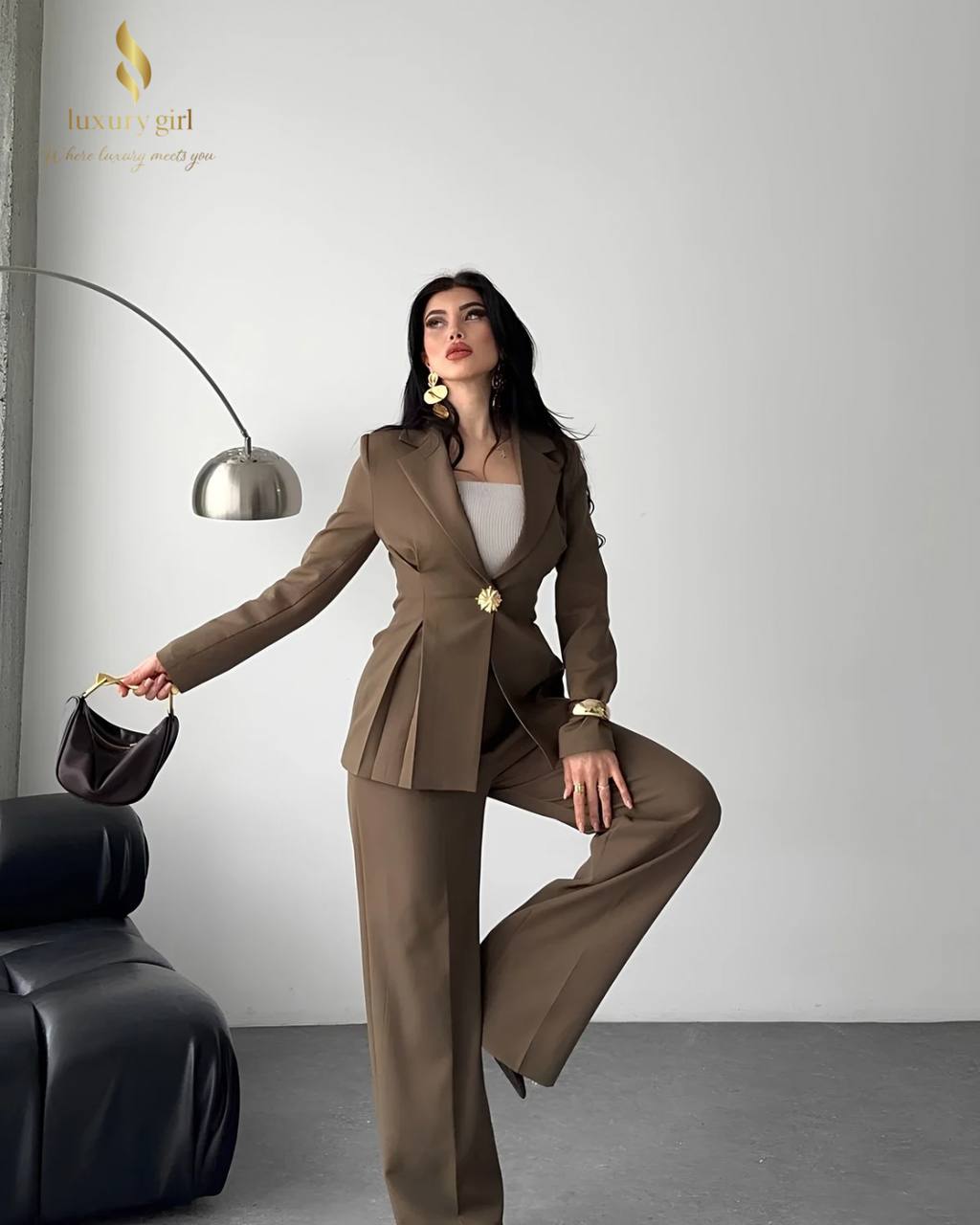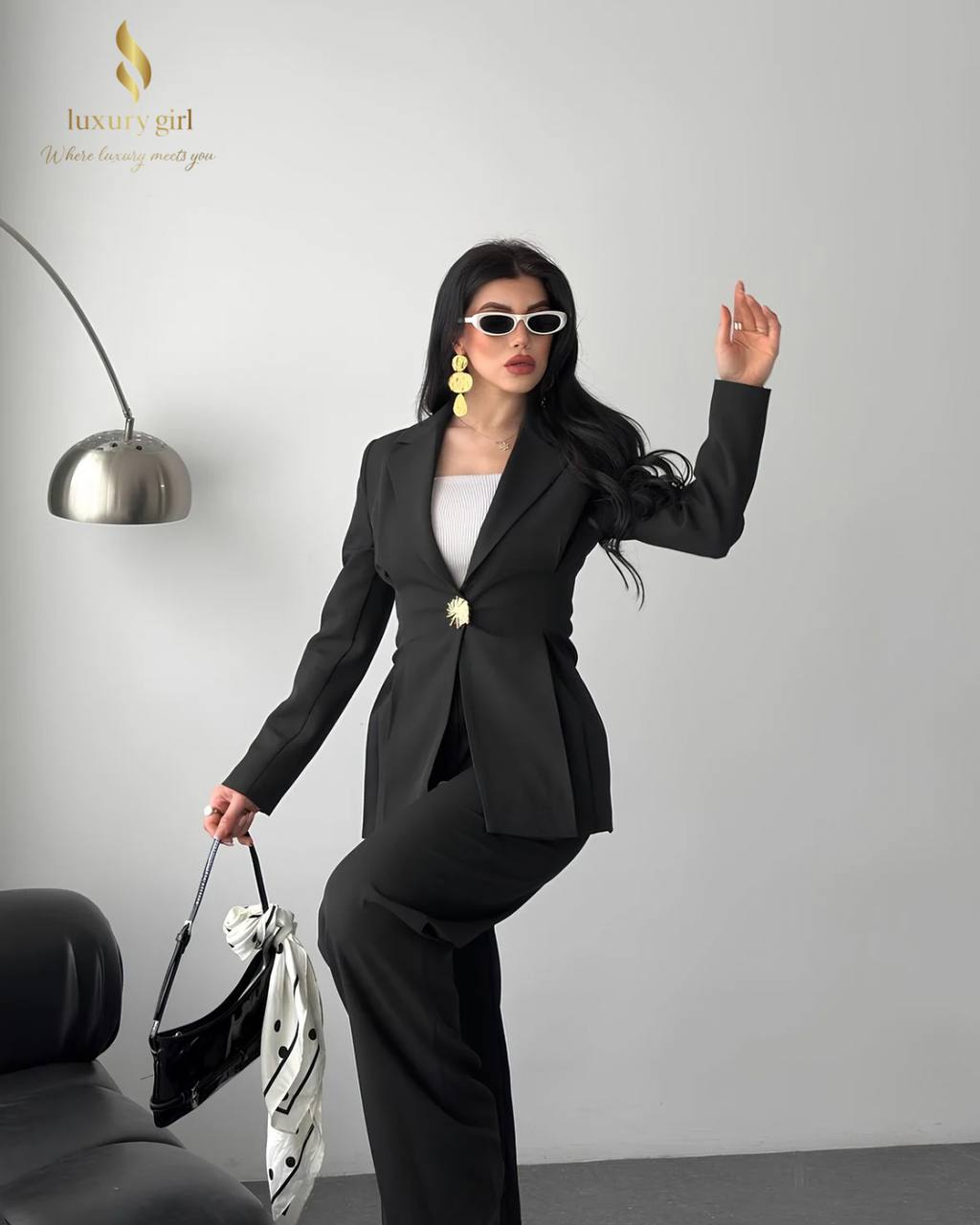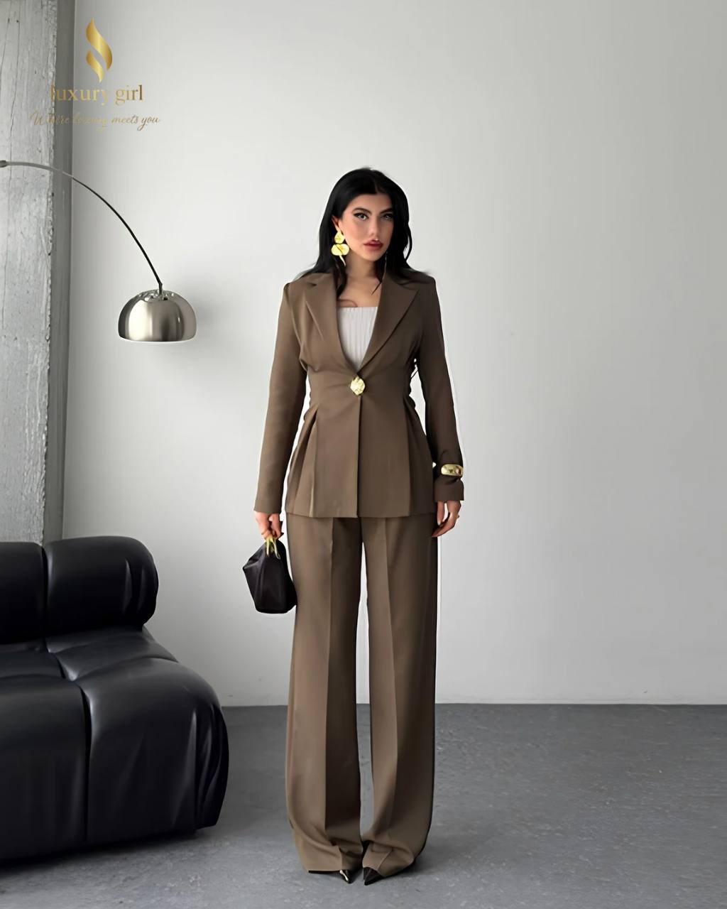 طقم أنيق بتصميم كلاسيكي فاخر يعكس قوة الحضور وجاذبية التفاصيل. يتميز بقصة محددة تبرز القوام بأسلوب راقٍ، مع لمسة ذهبية فاخرة في المنتصف تضيف طابعًا مميزًا. مثالي للإطلالات الرسمية والاجتماعات والخروجات الراقية.