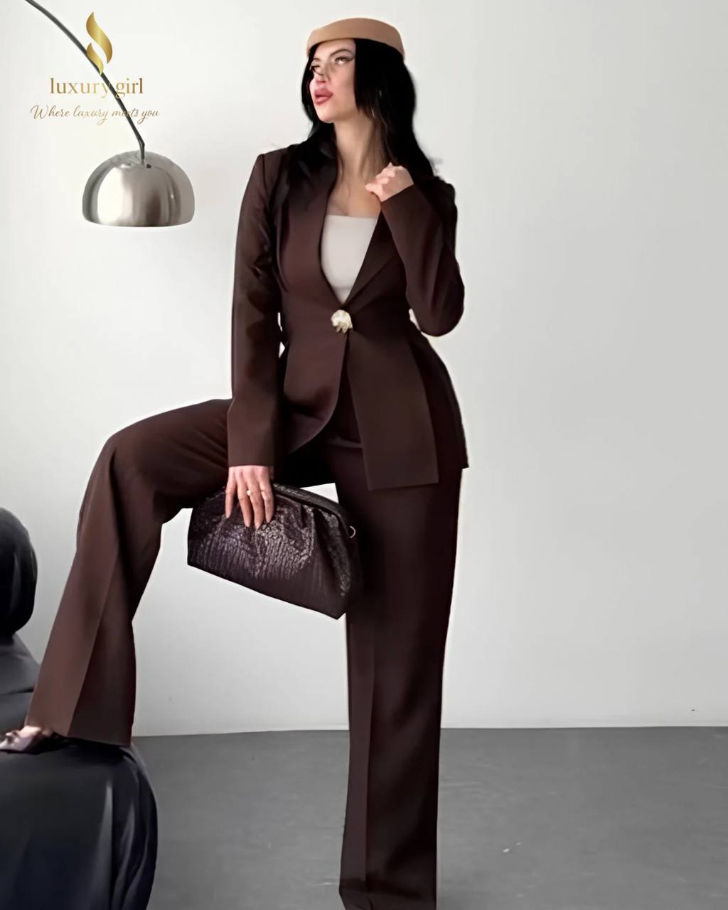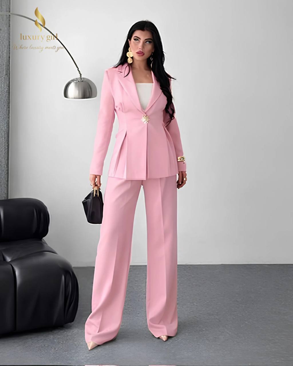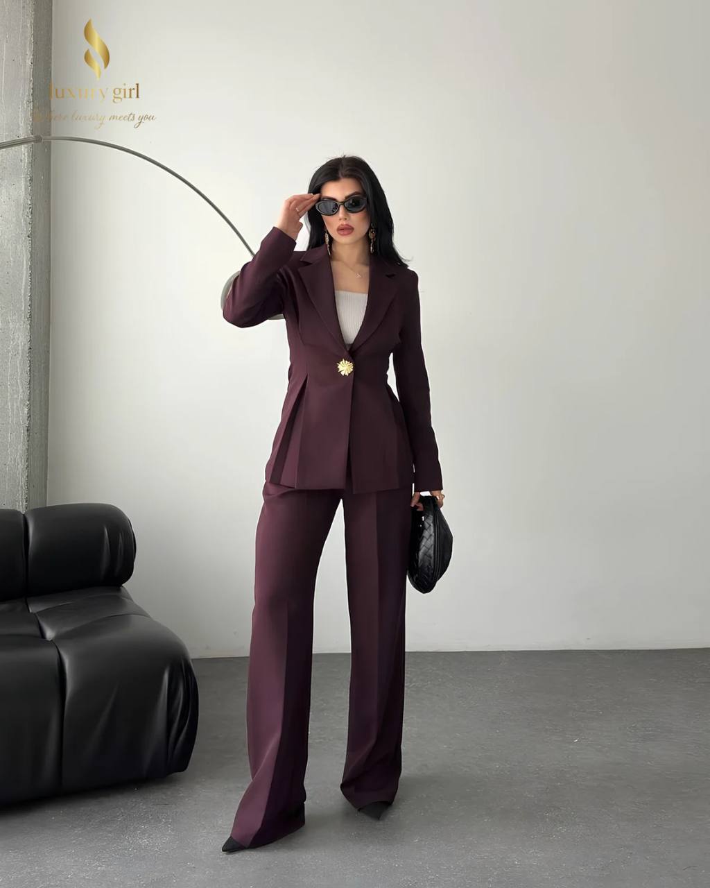 طقم أنيق بتصميم كلاسيكي فاخر يعكس قوة الحضور وجاذبية التفاصيل. يتميز بقصة محددة تبرز القوام بأسلوب راقٍ، مع لمسة ذهبية فاخرة في المنتصف تضيف طابعًا مميزًا. مثالي للإطلالات الرسمية والاجتماعات والخروجات الراقية.