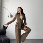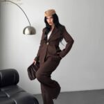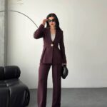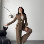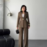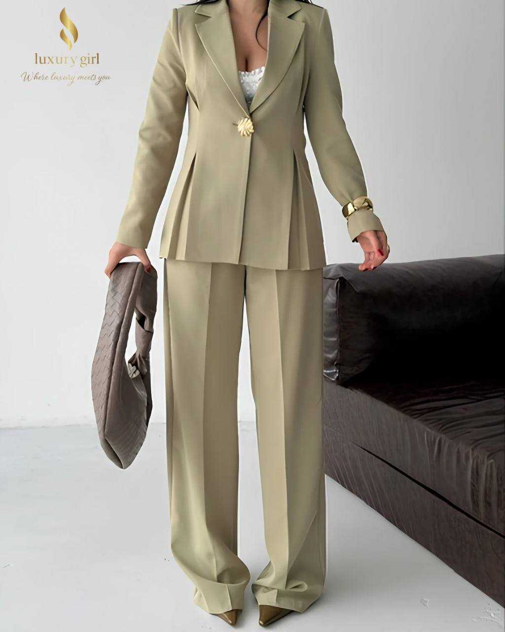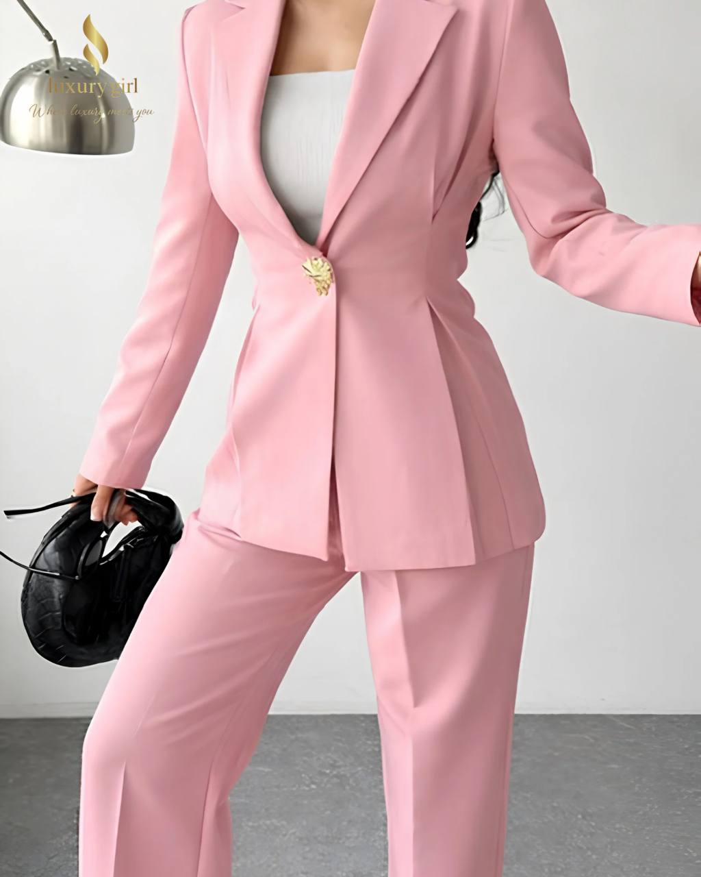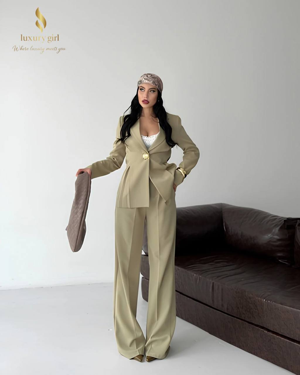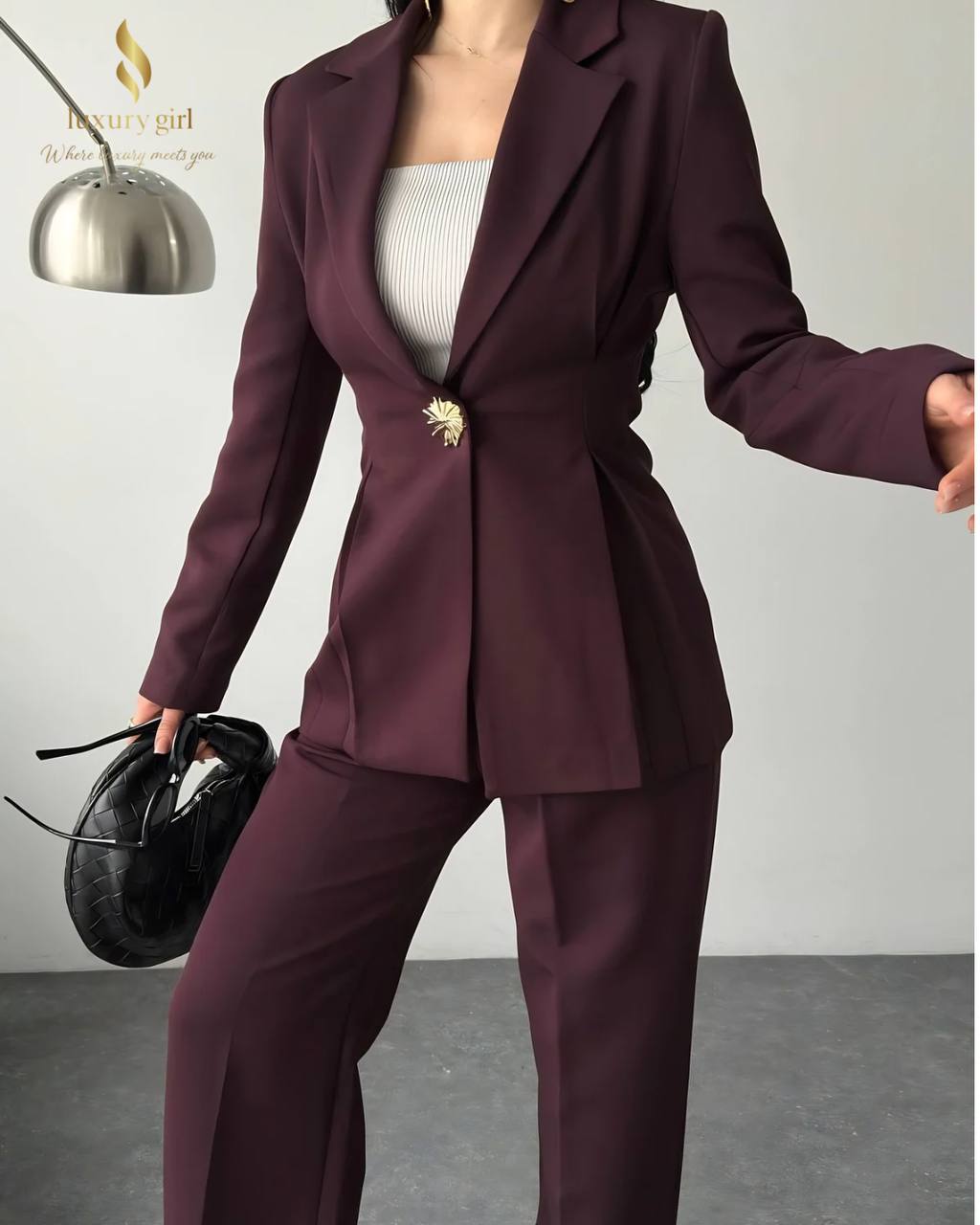 طقم أنيق بتصميم كلاسيكي فاخر يعكس قوة الحضور وجاذبية التفاصيل. يتميز بقصة محددة تبرز القوام بأسلوب راقٍ، مع لمسة ذهبية فاخرة في المنتصف تضيف طابعًا مميزًا. مثالي للإطلالات الرسمية والاجتماعات والخروجات الراقية.
